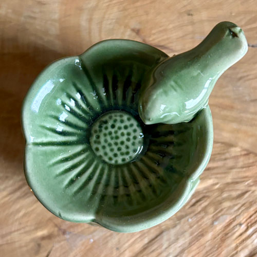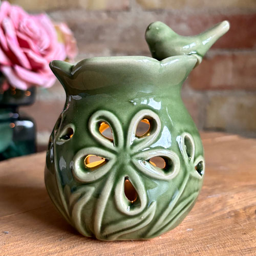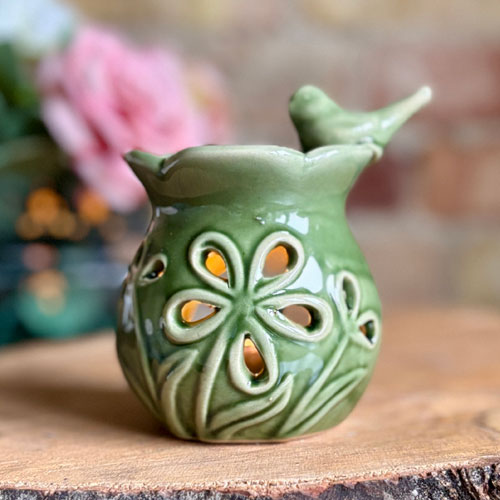 Duftlampe | fuglebad med blomster i keramik udskåret med blomster og med olivengrøn glassur.
