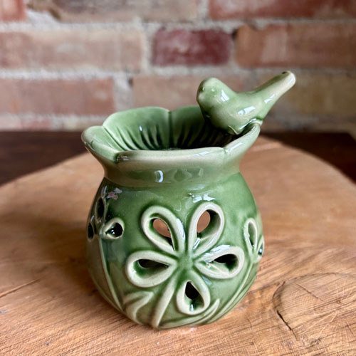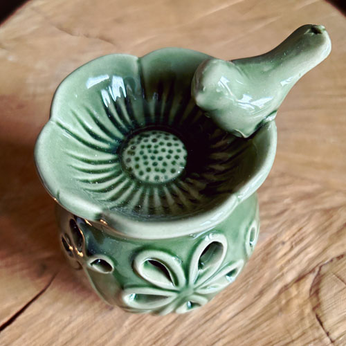 Duftlampe | fuglebad med blomster udskåret i keramik med olivengrøn glassur er en lille duftlampe.