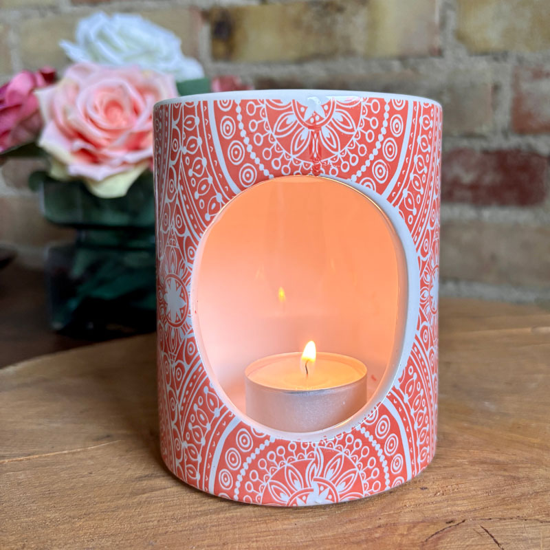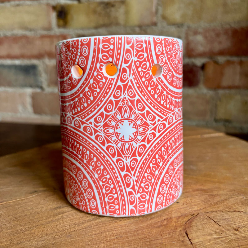 Duftlampe | retro festival med hvid glassur og orange mønster.