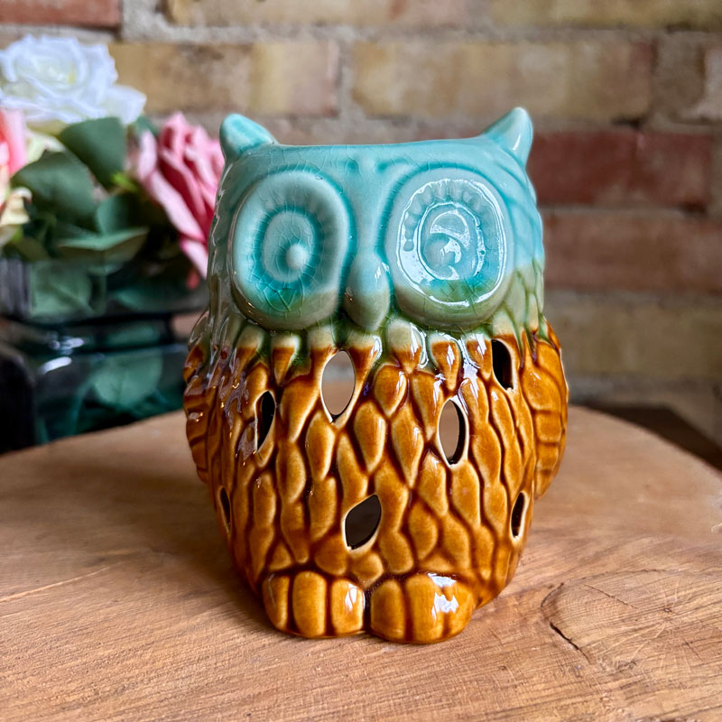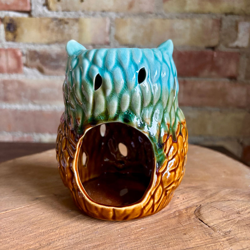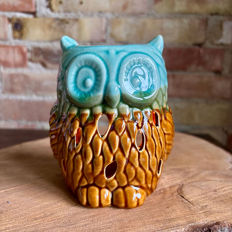 Duftlampe | ugle med gylden og grøn glassur.